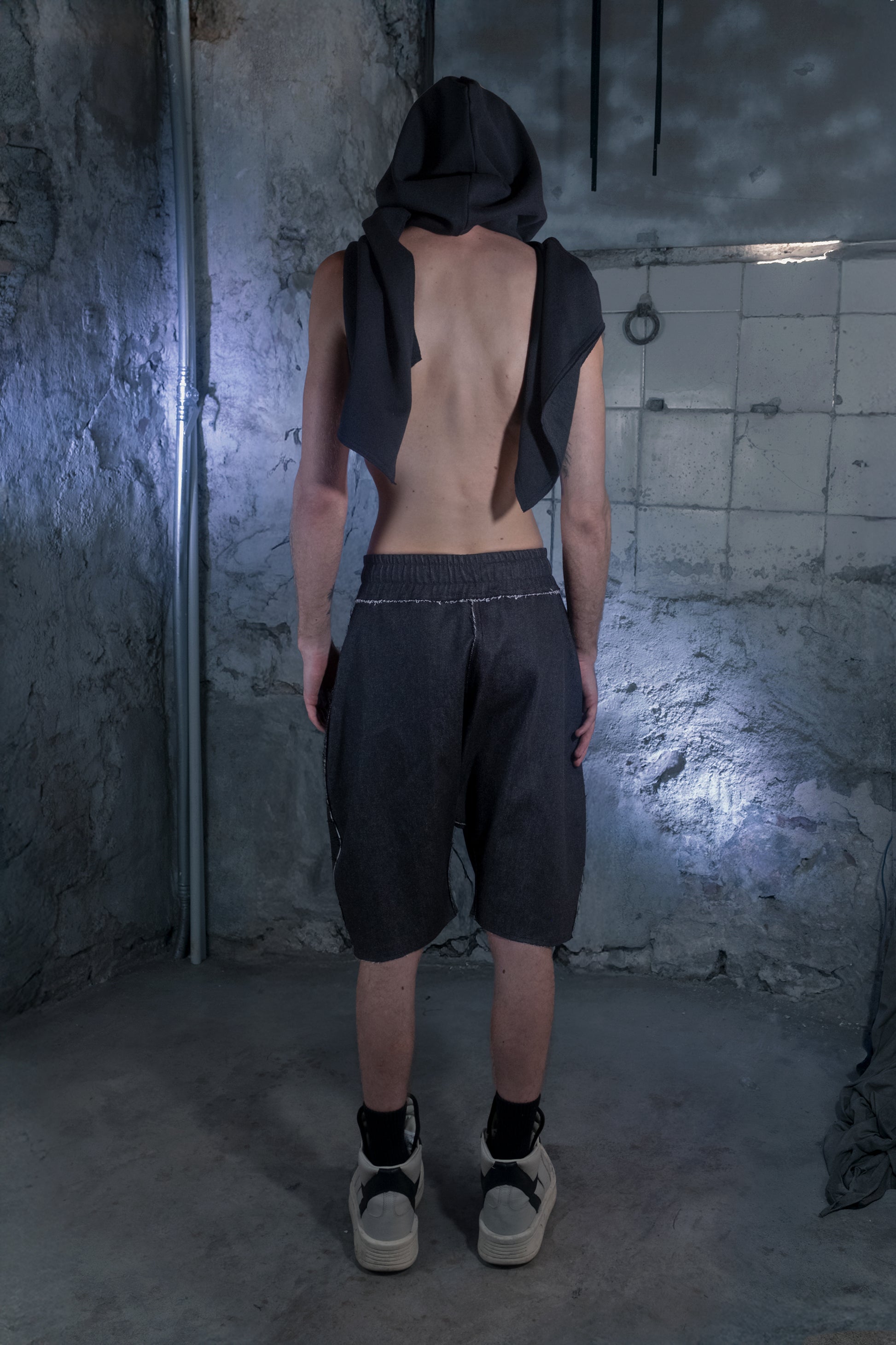 Its multifunctional design allows it to be worn in different ways: as a hood for a mysterious look, as a wrapping scarf, or draped over the shoulders like a shawl. The edges are finished with cotton tape, maintaining a polished and contemporary aesthetic.