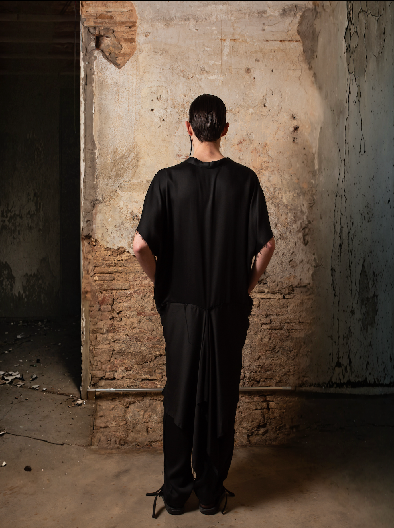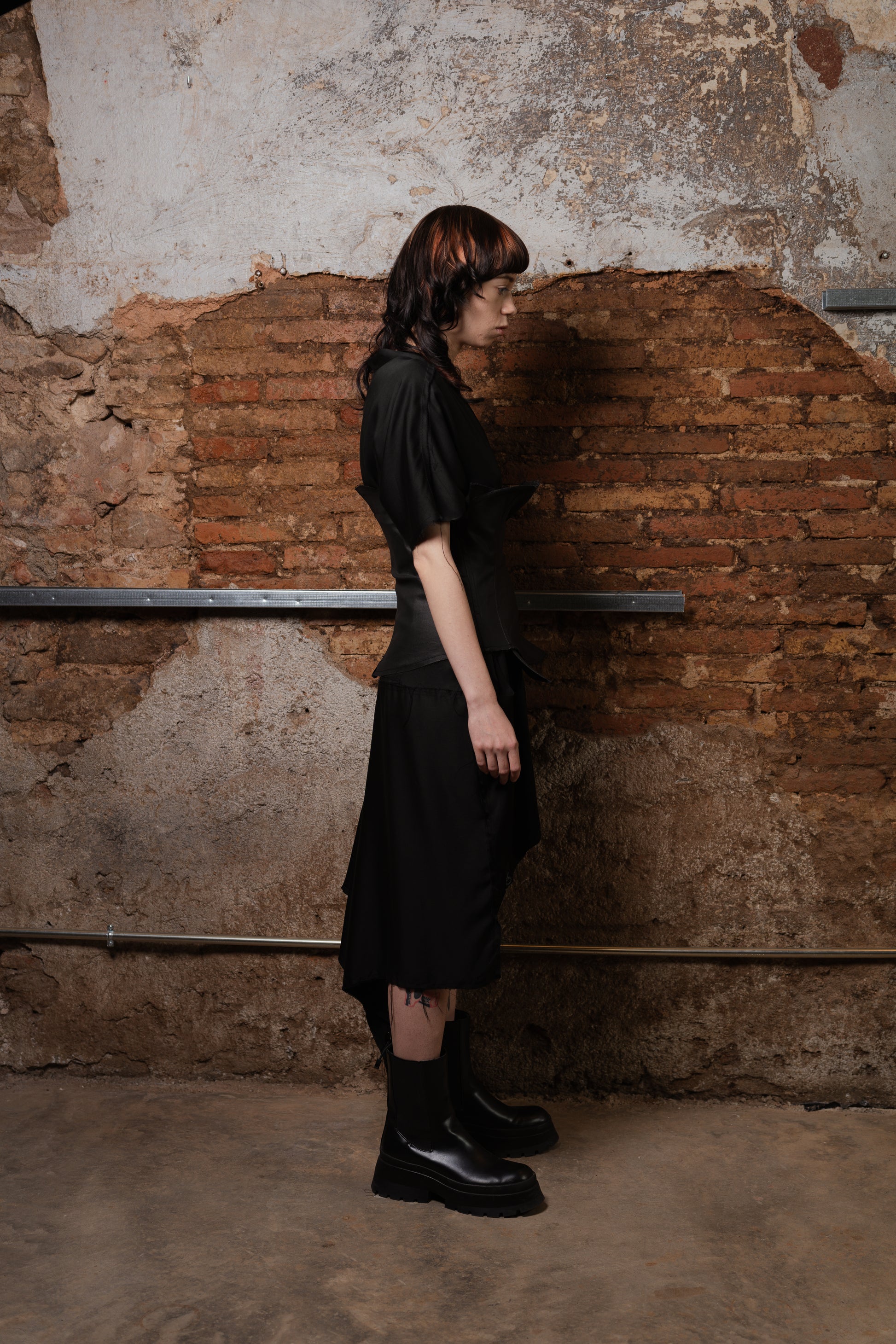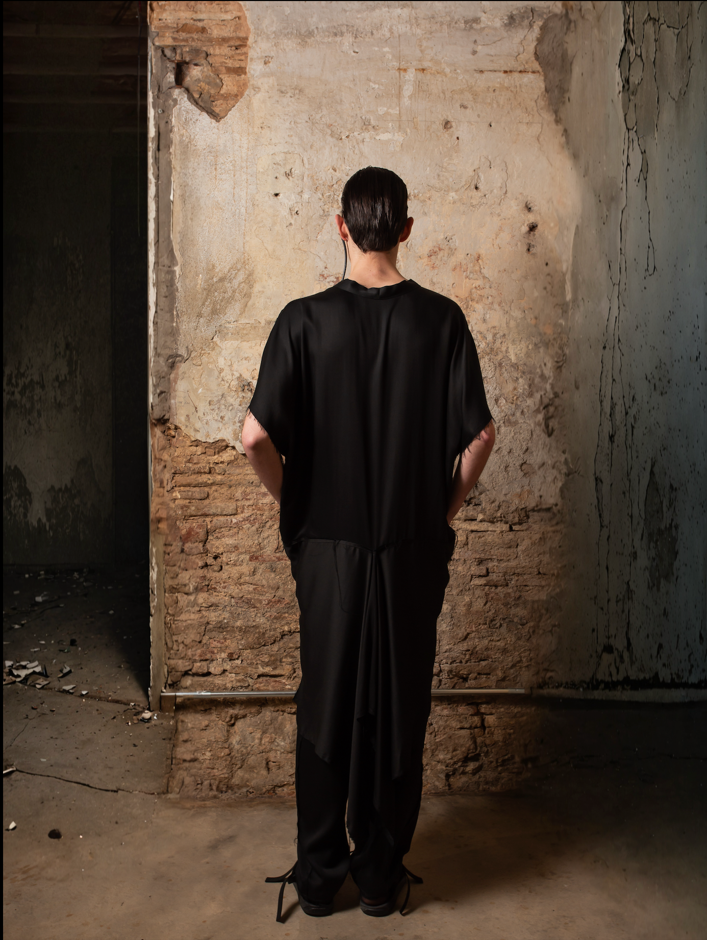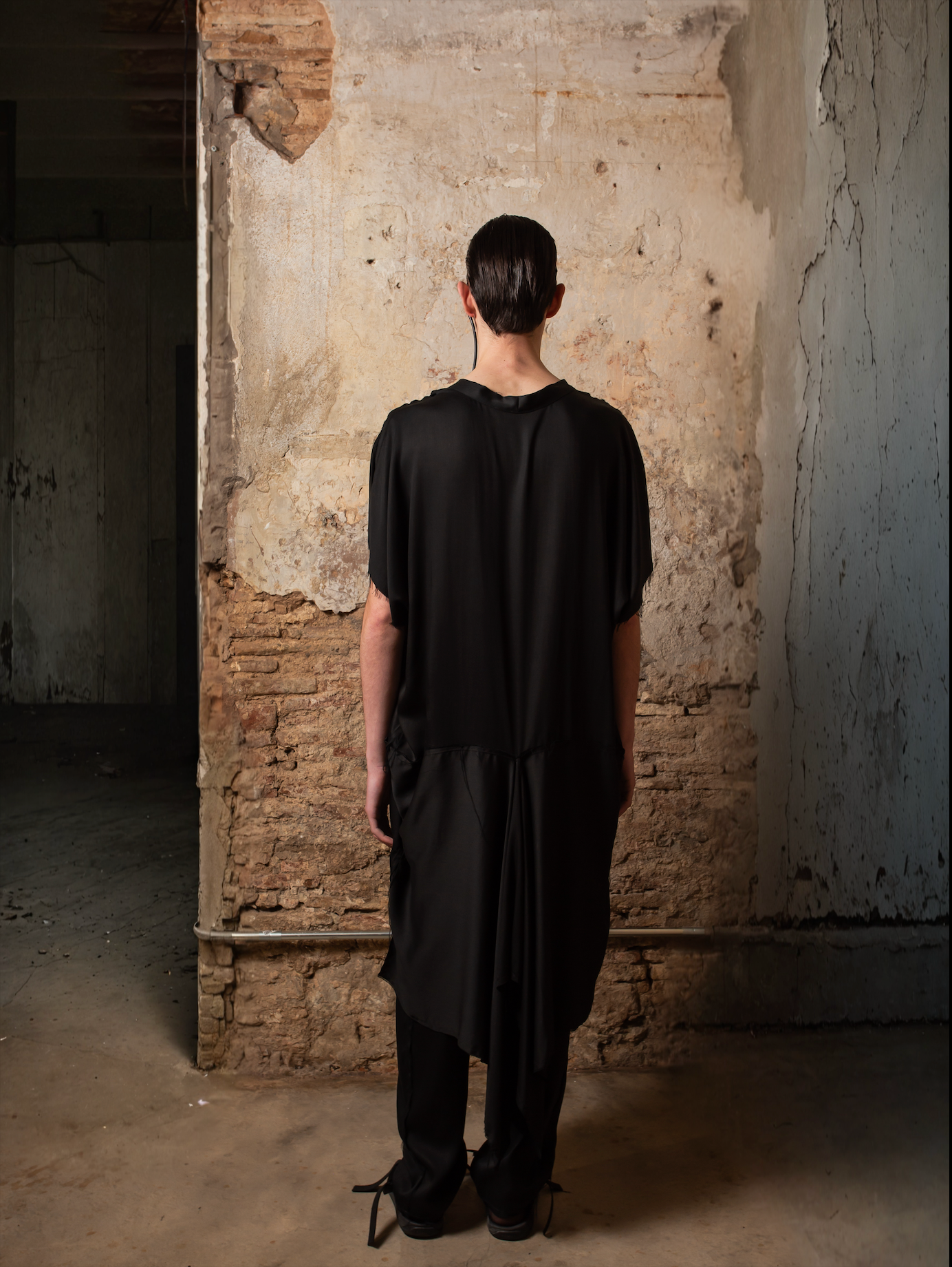 Lo que hace única a esta prenda es su espalda innovadora: desde la cintura, el tejido se prolonga en un rectángulo integrado al patrón, abierto desde el centro para generar una cola voluminosa, con drapeados y picos dinámicos que se mueven con el cuerpo. El tejido de acabado satinado y bordes deshilachados refuerza su estética deconstruida, dándole un carácter etéreo y moderno.