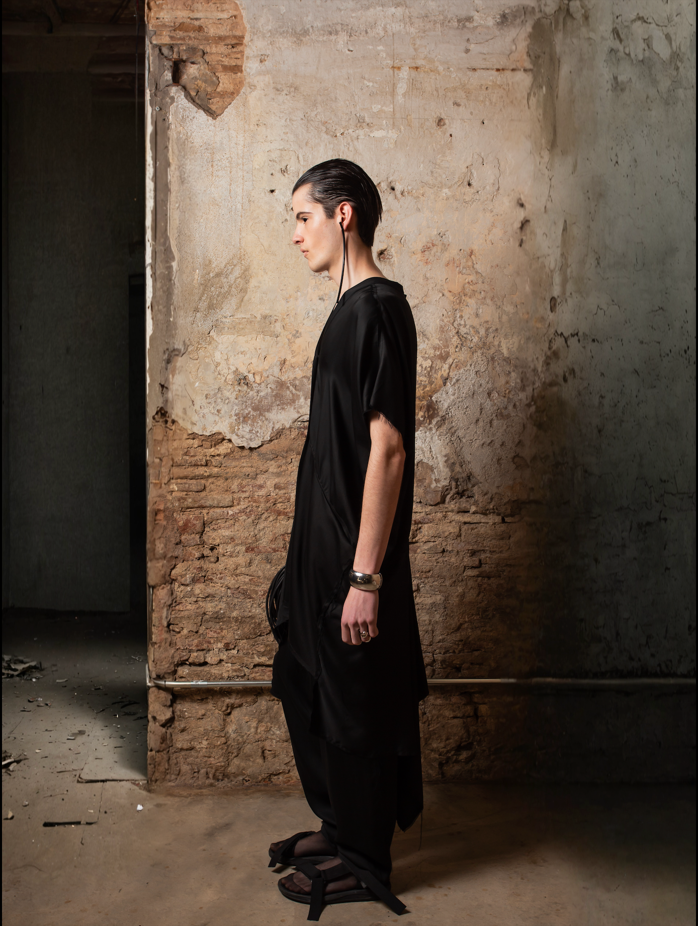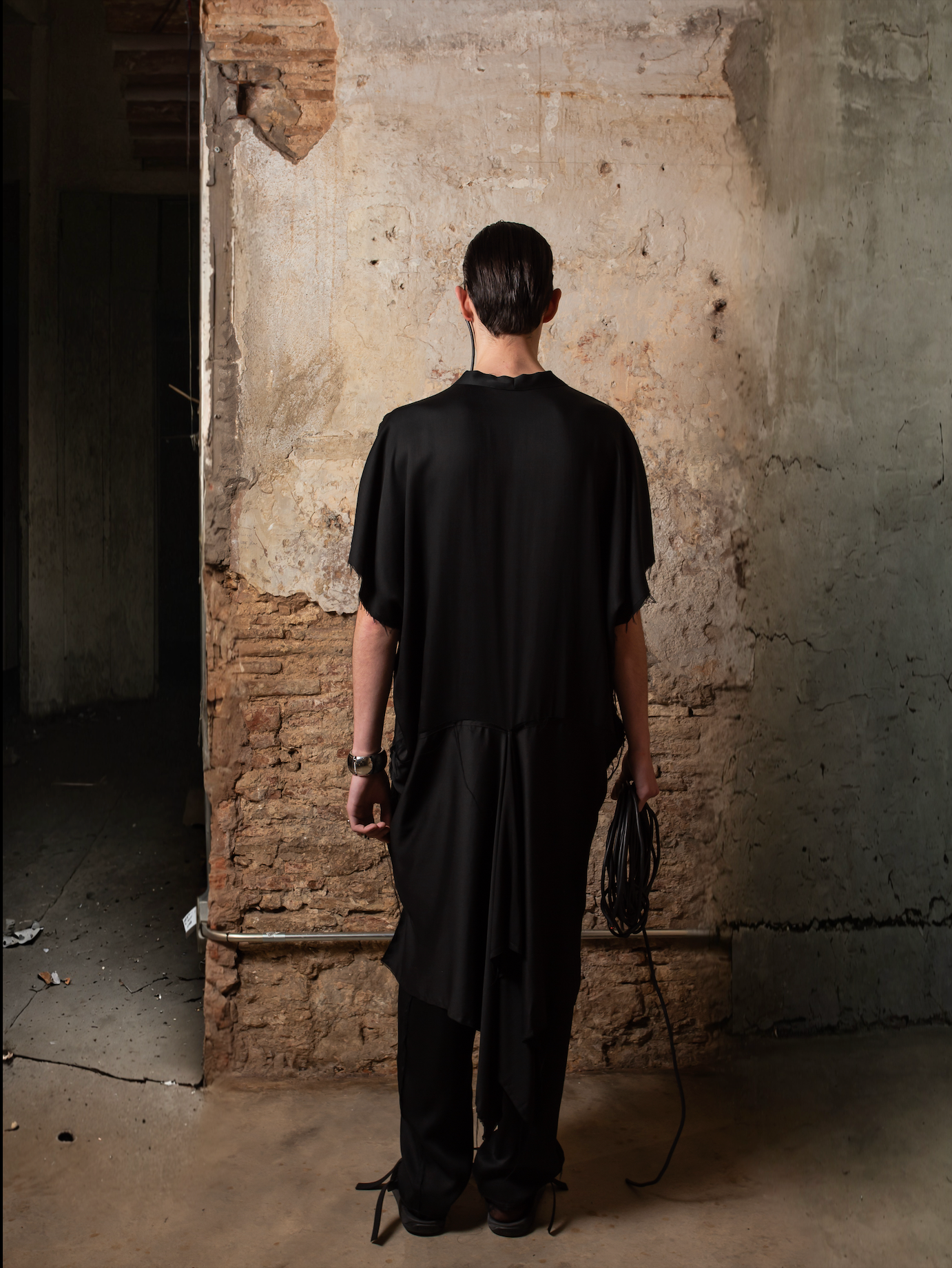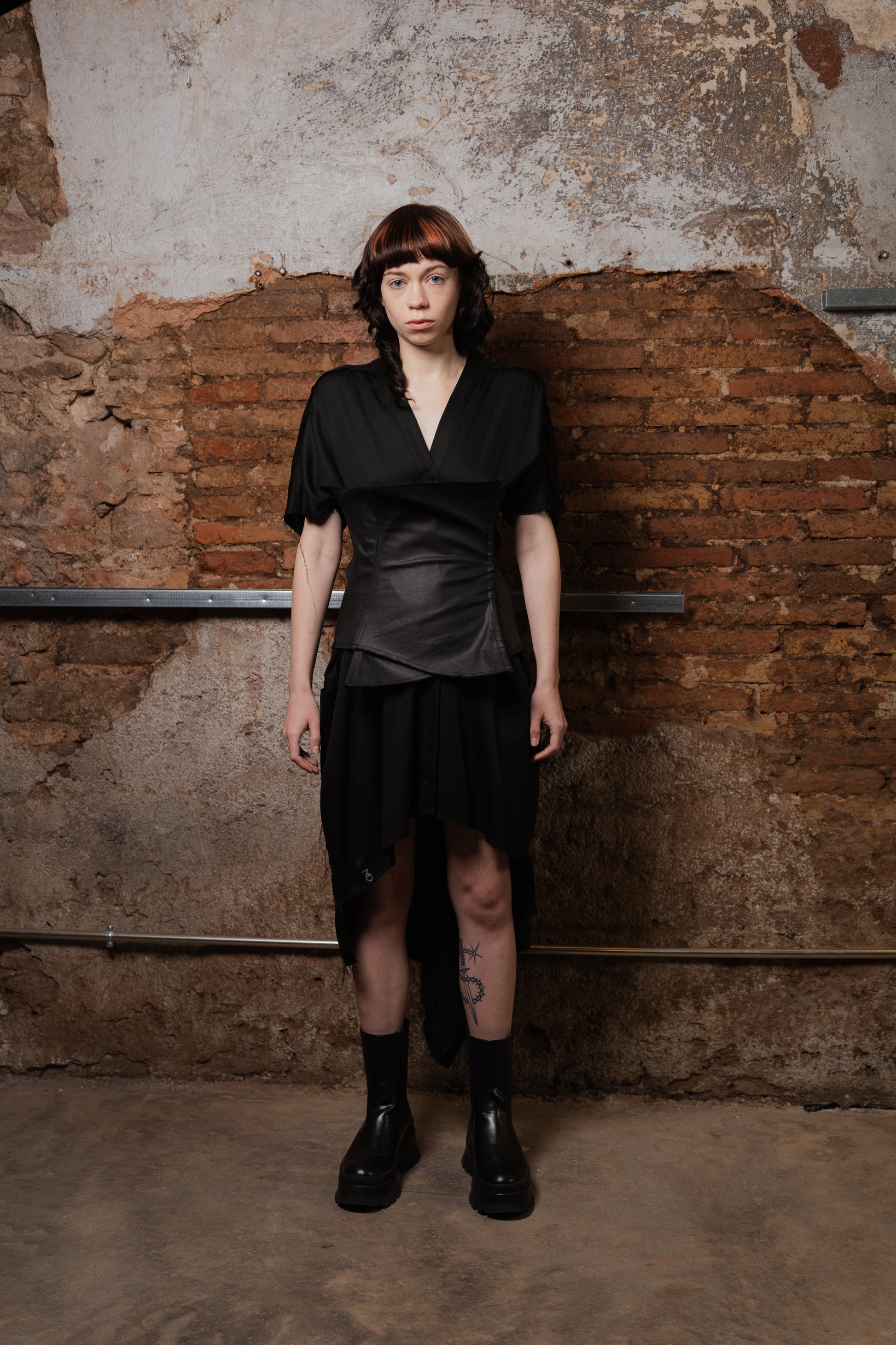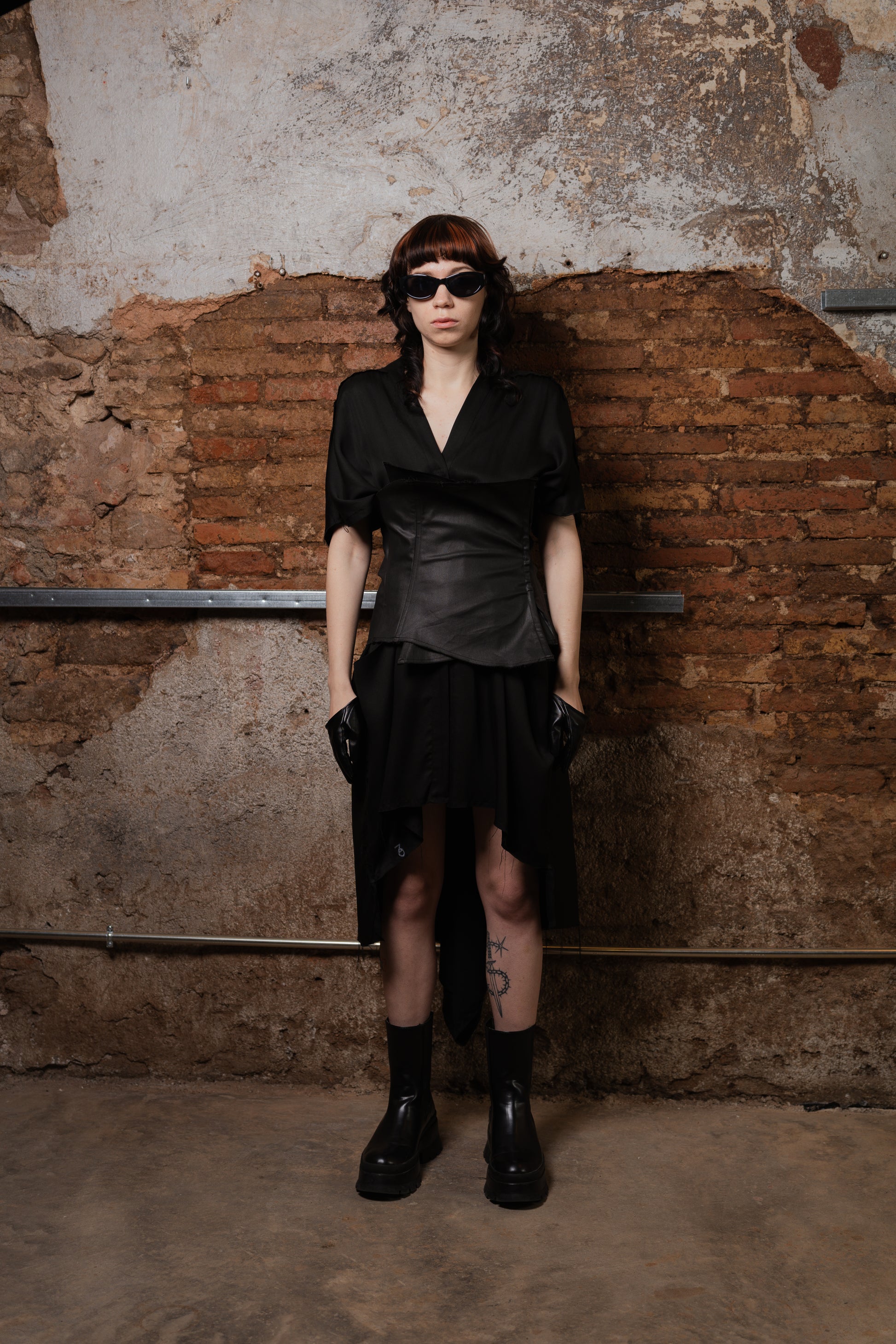 Lo que hace única a esta prenda es su espalda innovadora: desde la cintura, el tejido se prolonga en un rectángulo integrado al patrón, abierto desde el centro para generar una cola voluminosa, con drapeados y picos dinámicos que se mueven con el cuerpo. El tejido de acabado satinado y bordes deshilachados refuerza su estética deconstruida, dándole un carácter etéreo y moderno.