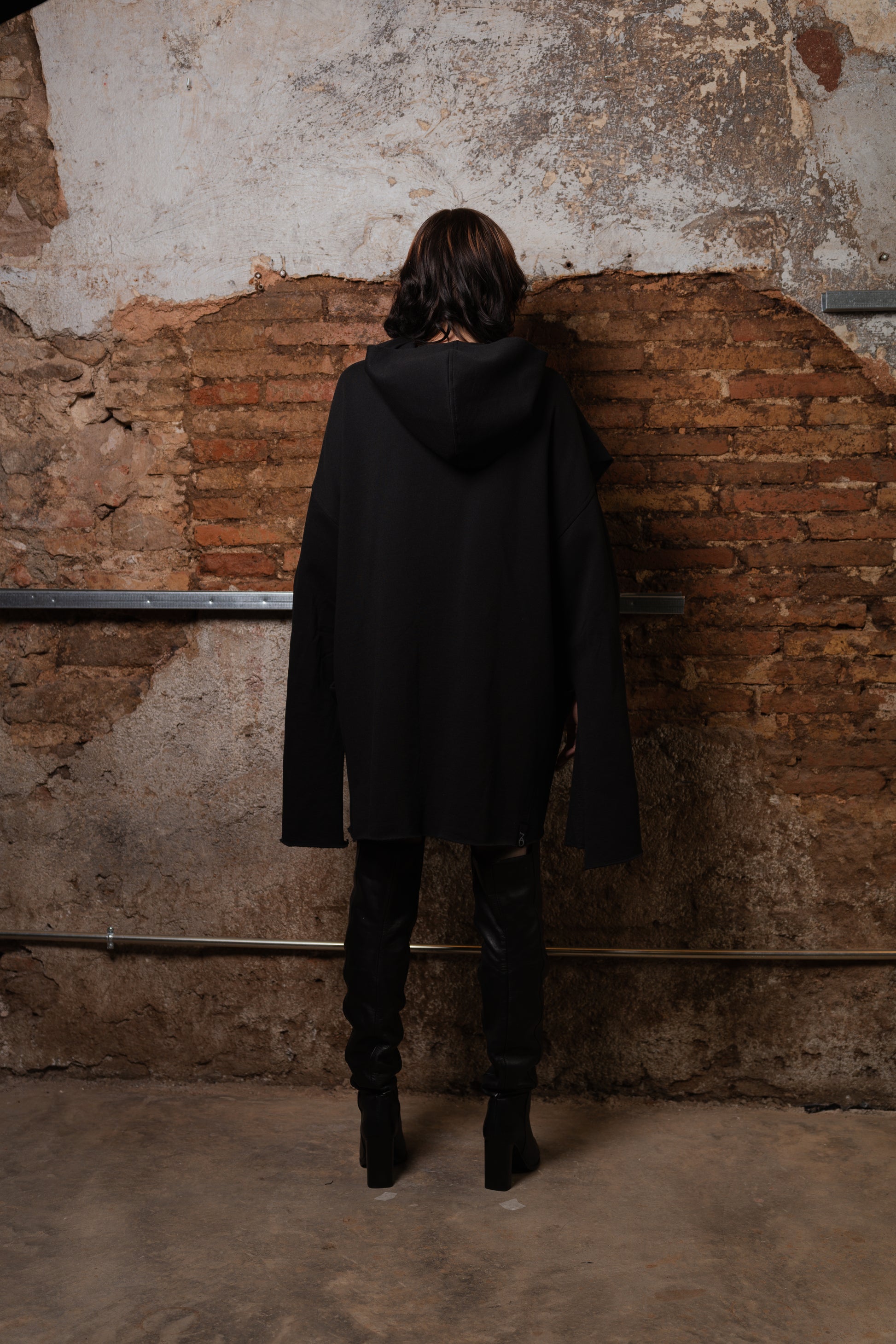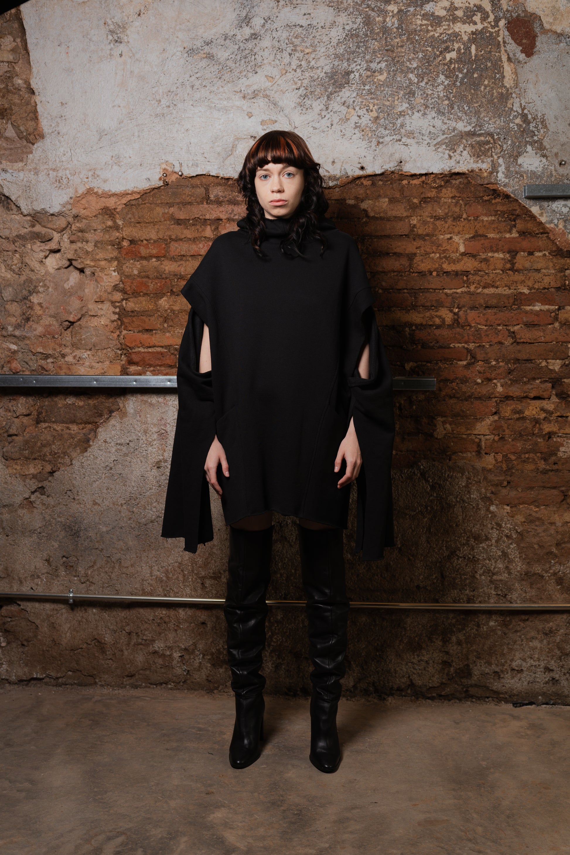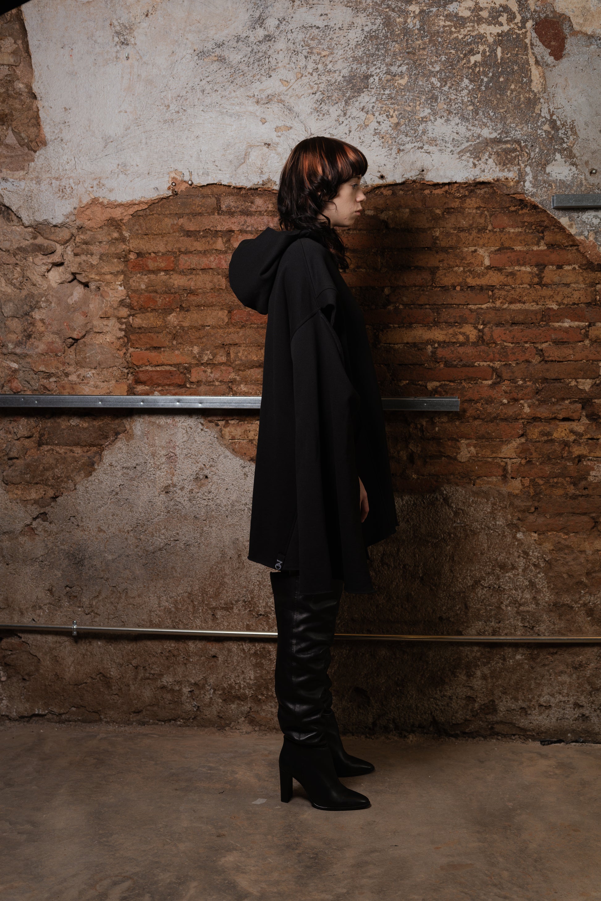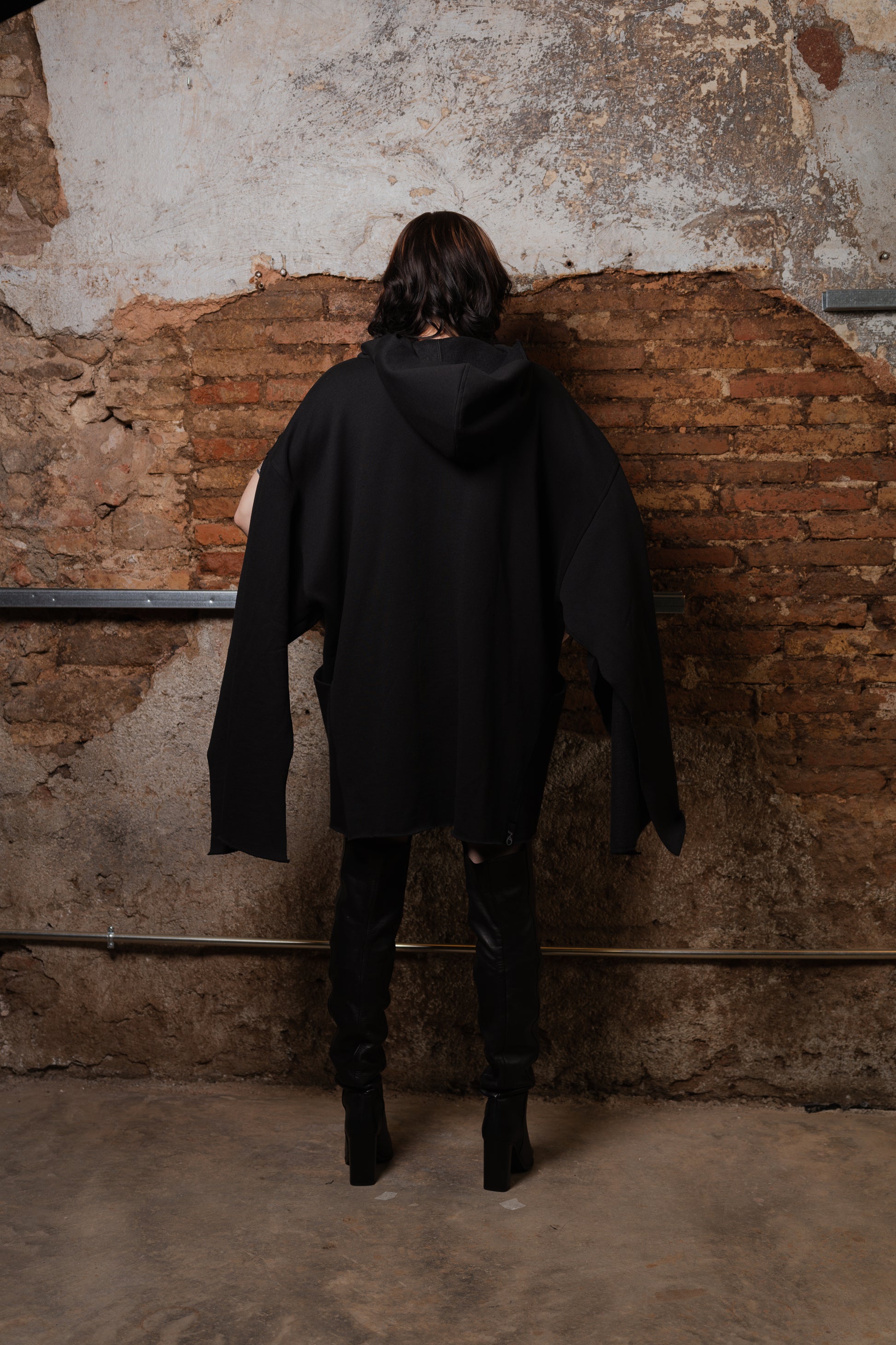 Este diseño híbrido entre sudadera y poncho presenta un fit oversize que cubre los glúteos, ofreciendo una silueta relajada y fluida. Sus mangas acampanadas y desmontables, junto con las aberturas delanteras, permiten llevarla con o sin mangas según la ocasión, realzando su carácter transformable. La capucha amplia añade un toque práctico y moderno, mientras que los grandes bolsillos monolitos de inspiración Bauhaus aportan un elemento minimalista y funcional característico de Zhannaona.