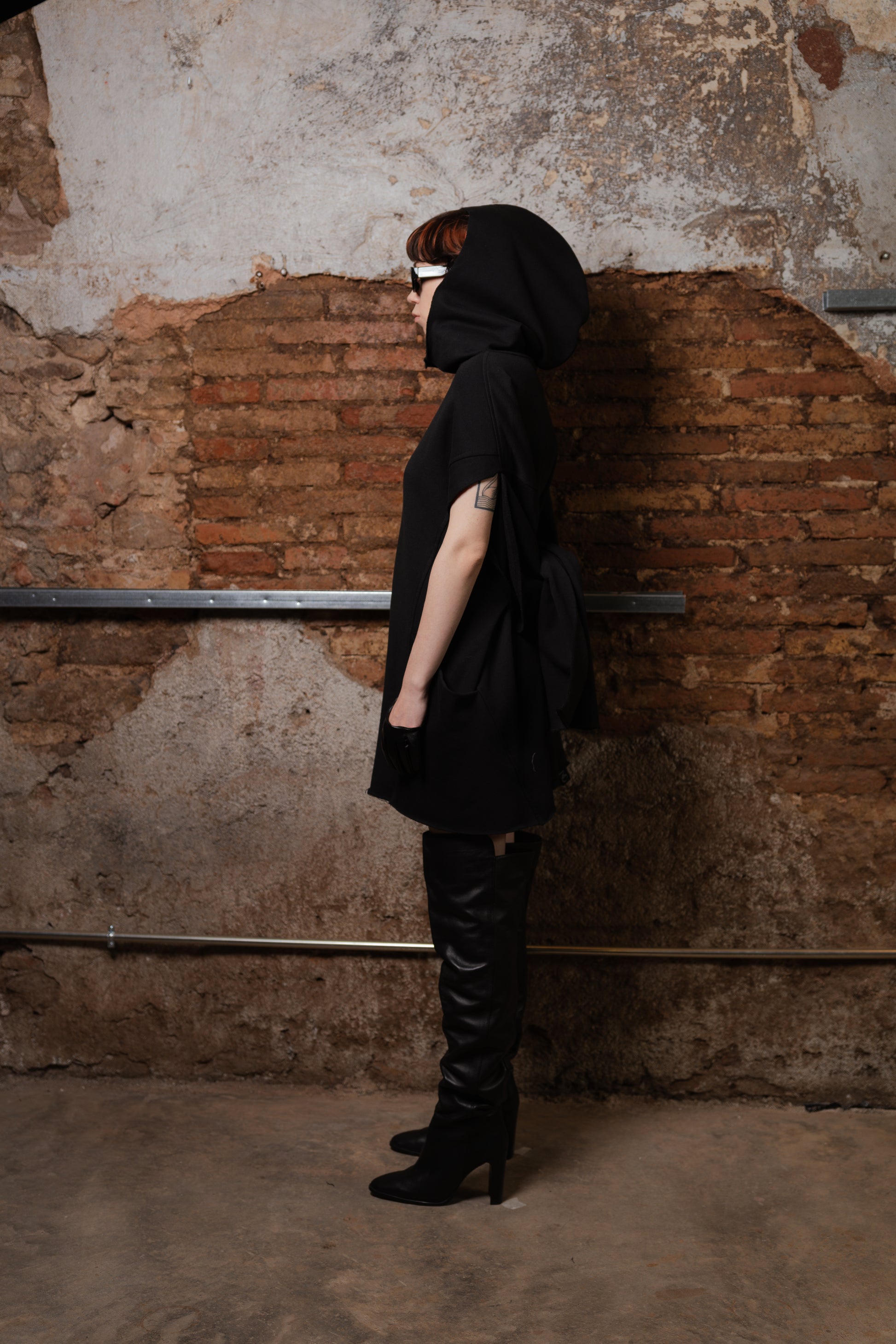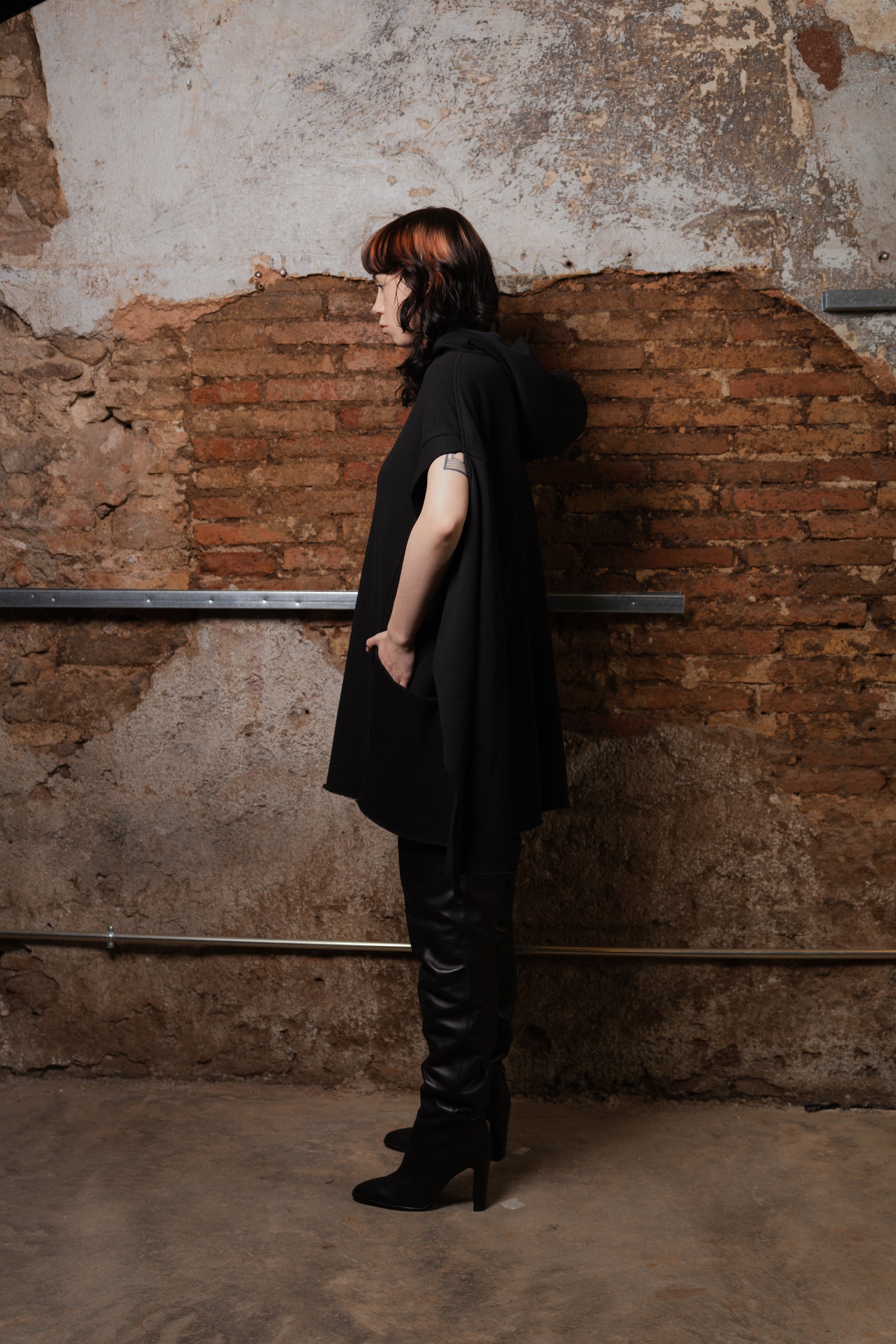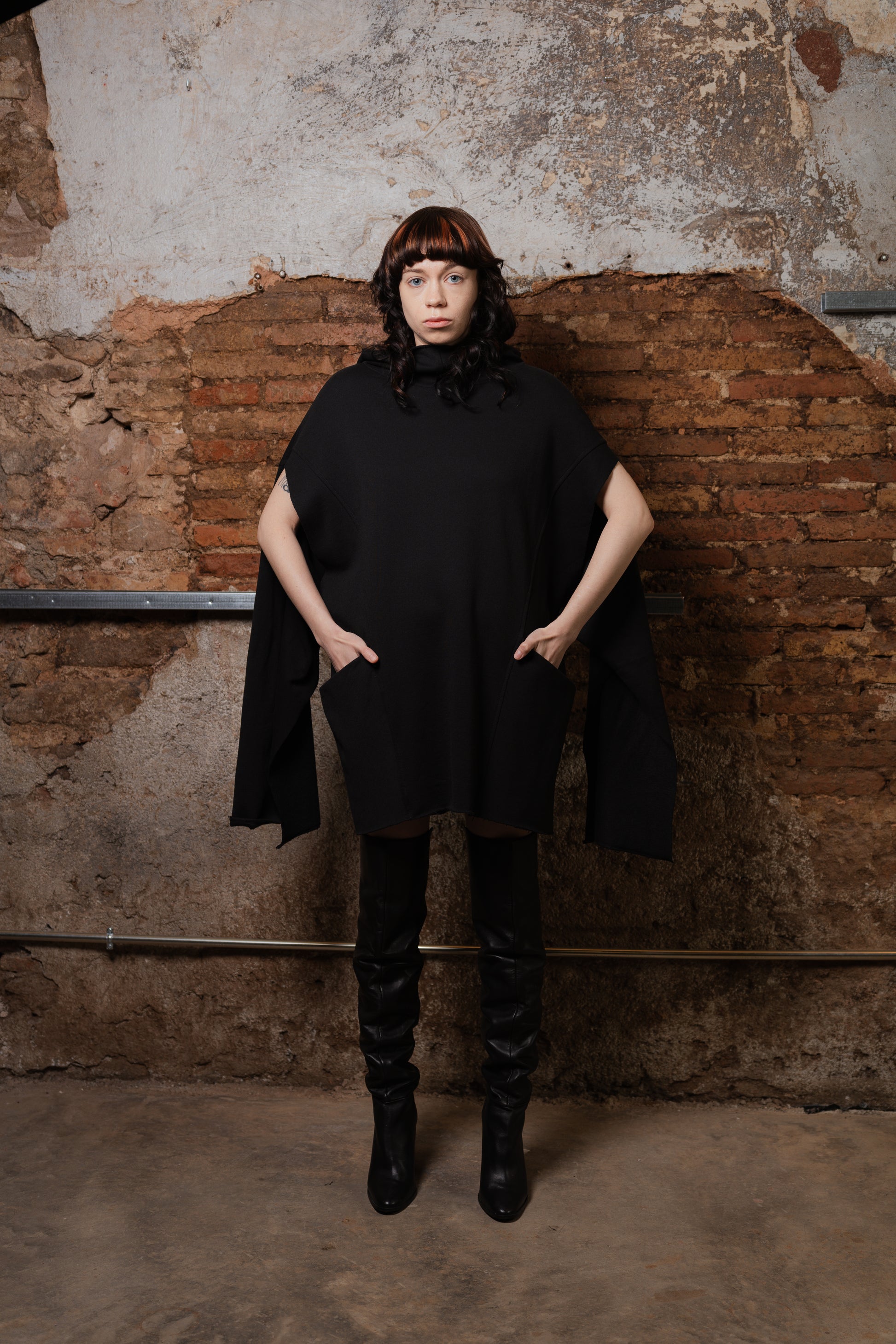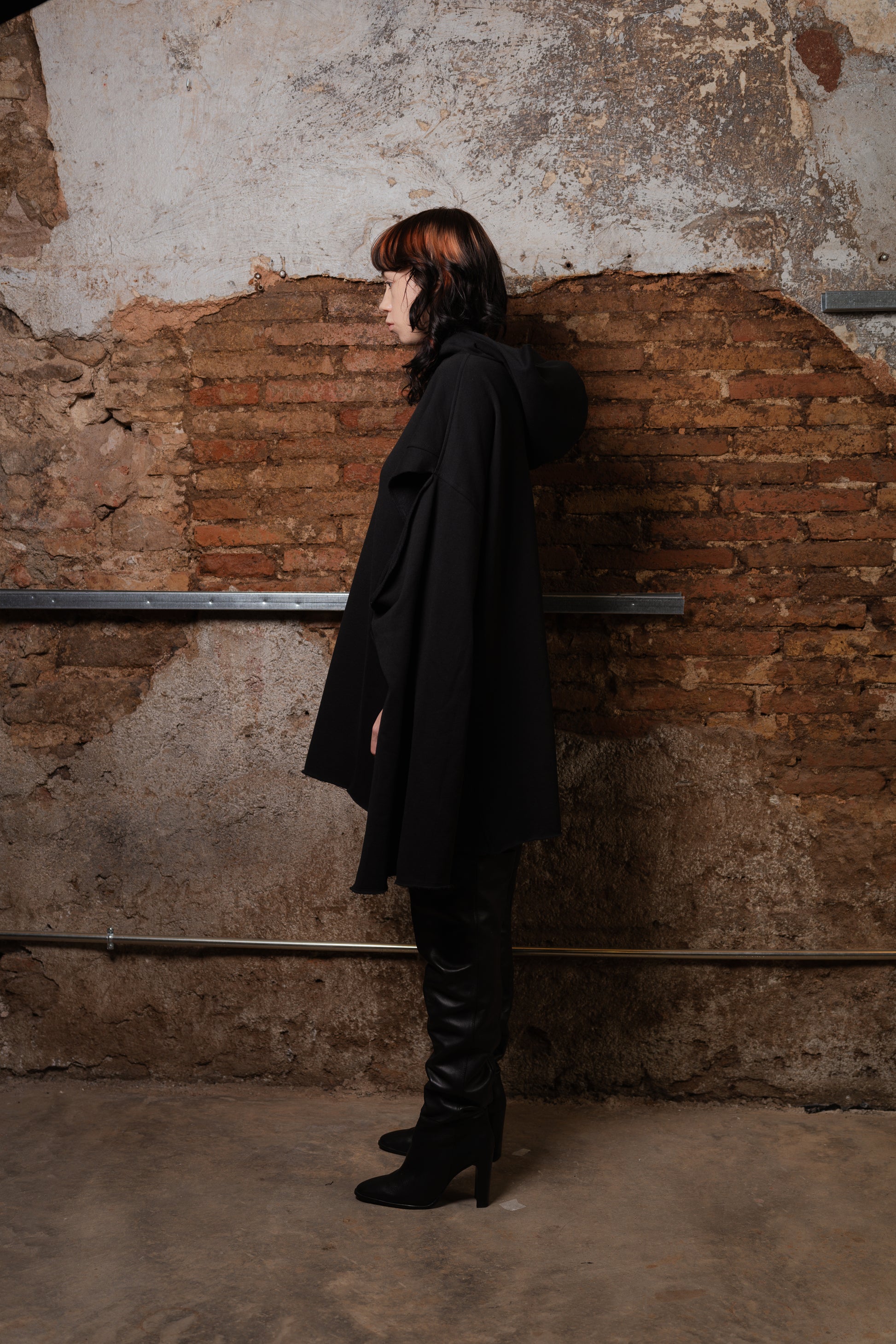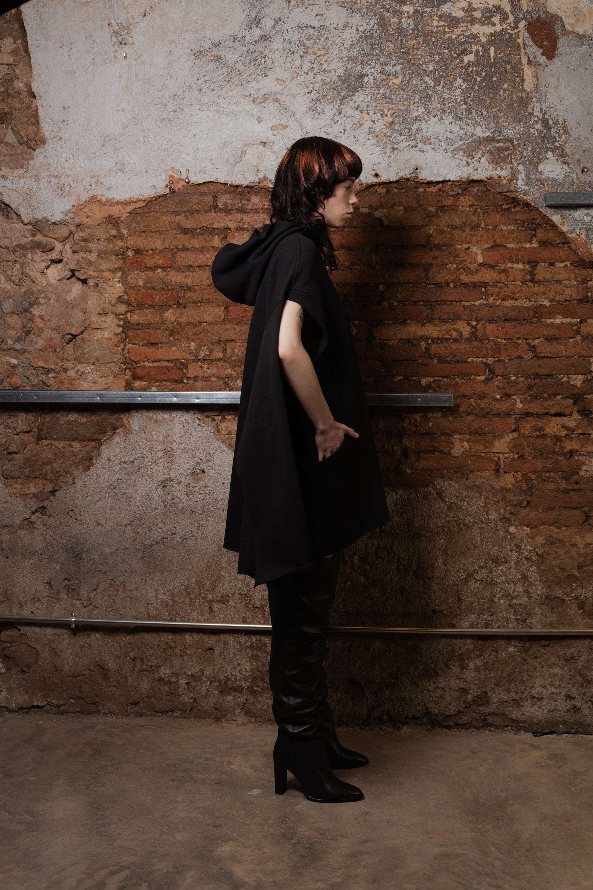 Este diseño híbrido entre sudadera y poncho presenta un fit oversize que cubre los glúteos, ofreciendo una silueta relajada y fluida. Sus mangas acampanadas y desmontables, junto con las aberturas delanteras, permiten llevarla con o sin mangas según la ocasión, realzando su carácter transformable. La capucha amplia añade un toque práctico y moderno, mientras que los grandes bolsillos monolitos de inspiración Bauhaus aportan un elemento minimalista y funcional característico de Zhannaona.
