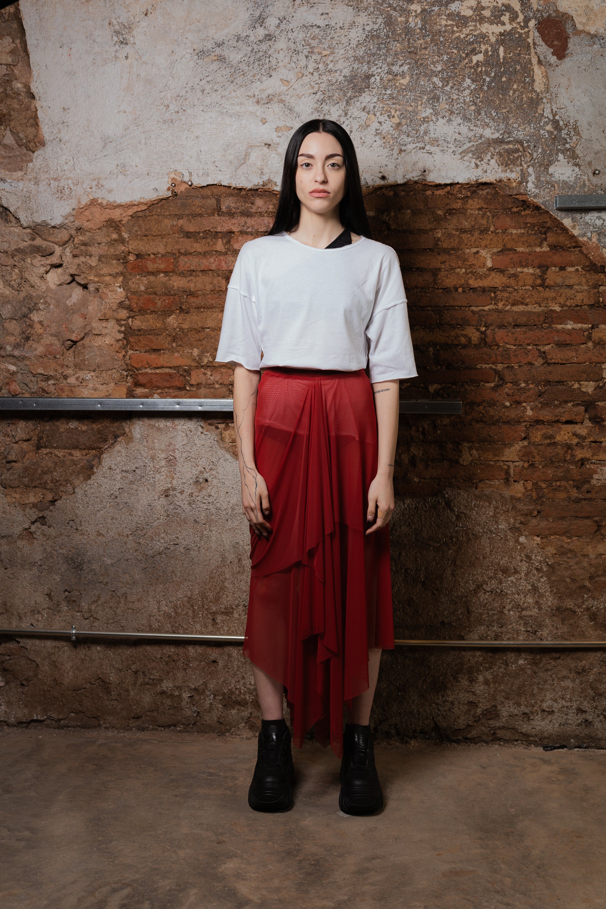La prenda se compone de dos capas en forma de cuadrados unidos de manera aleatoria, creando drapeados y picos en la parte inferior que le otorgan movimiento y dinamismo. El diseño asimétrico está pensado para adaptarse a diferentes tipos de cuerpo, realzando la silueta gracias a su cinturón elástico ajustado que garantiza comodidad sin sacrificar estilo.