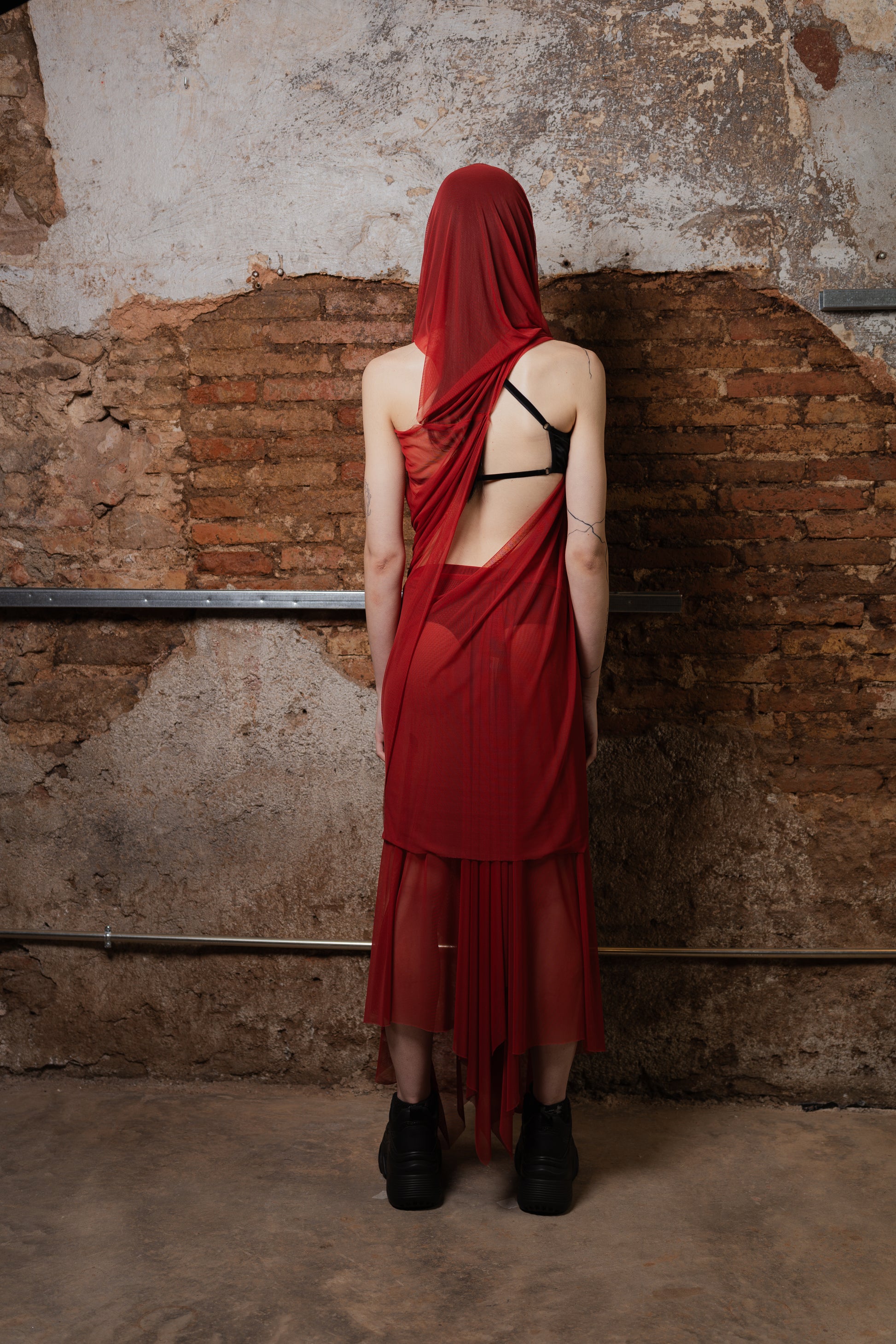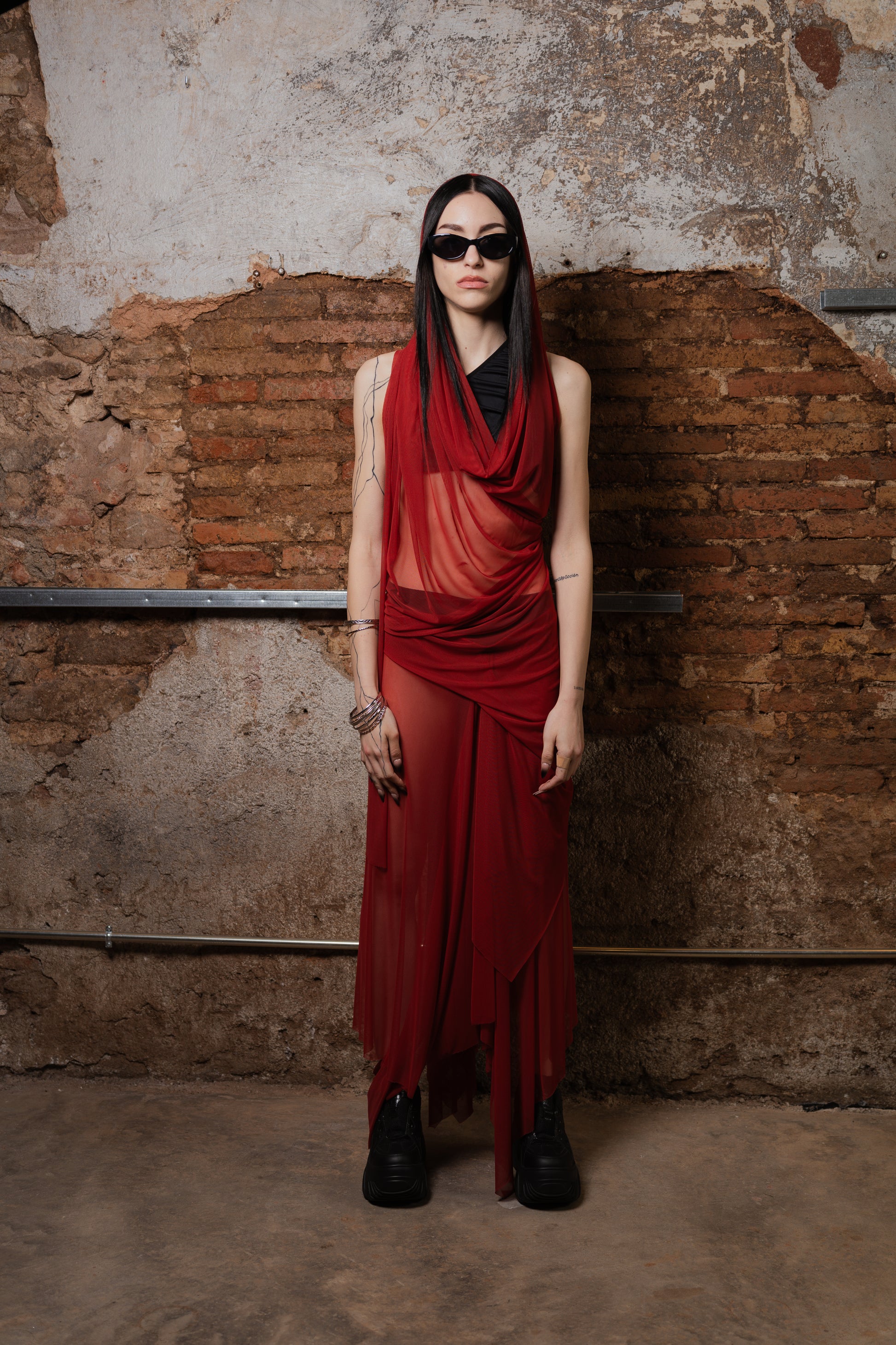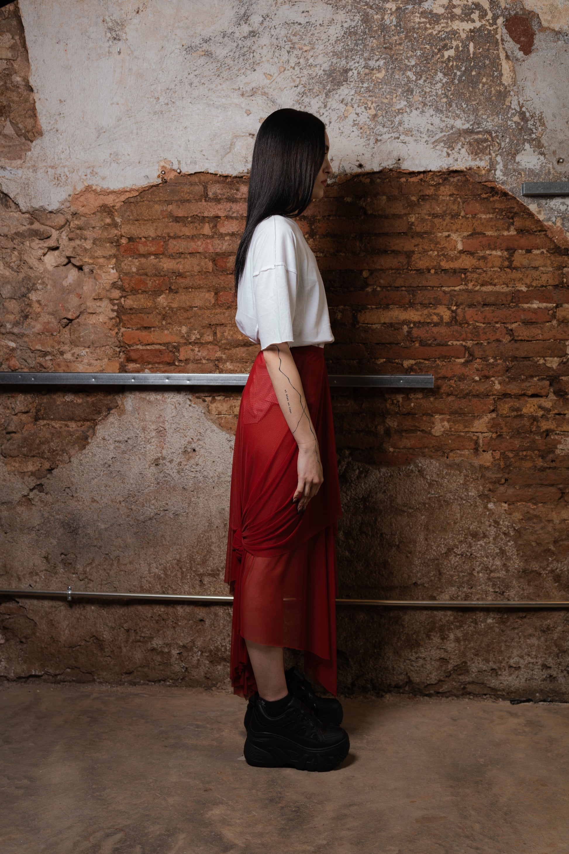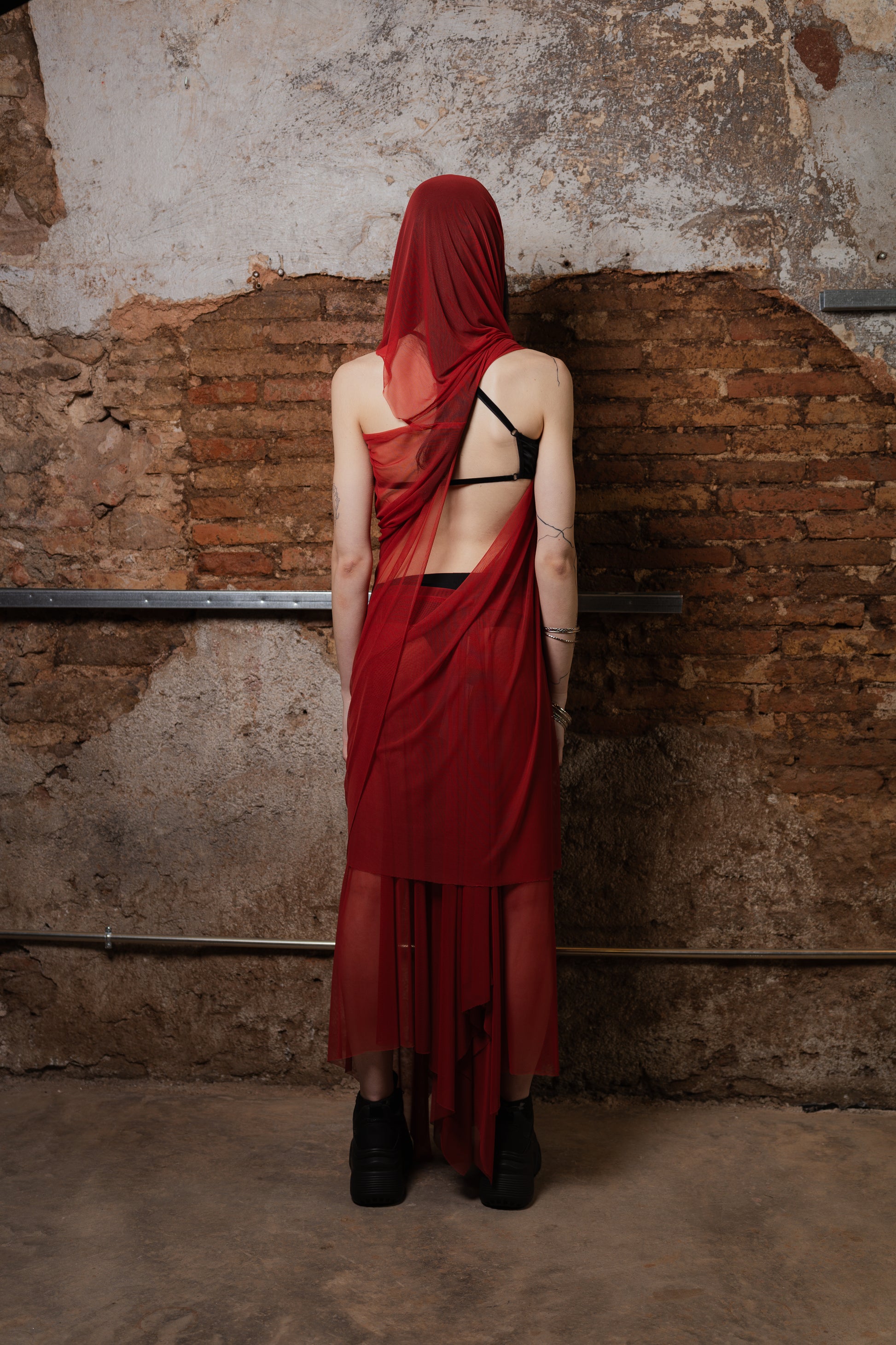 La verdadera magia de esta prenda radica en su capacidad transformable, siendo el núcleo de su diseño. La capa superior, cosida en dos puntos del lado derecho, permite múltiples maneras de llevarla. Dale la vuelta, coloca el orificio en el cuello y conviértela en un elegante vestido translúcido, perfecto para combinar con ropa interior de vestir o sobre unos pantalones para un look más atrevido y gender fluid. También puedes llevarla al otro lado del cuerpo, creando una nueva silueta más recogida con drapeados únicos y artísticos, adaptándose a cada ocasión y necesidad de estilo.
