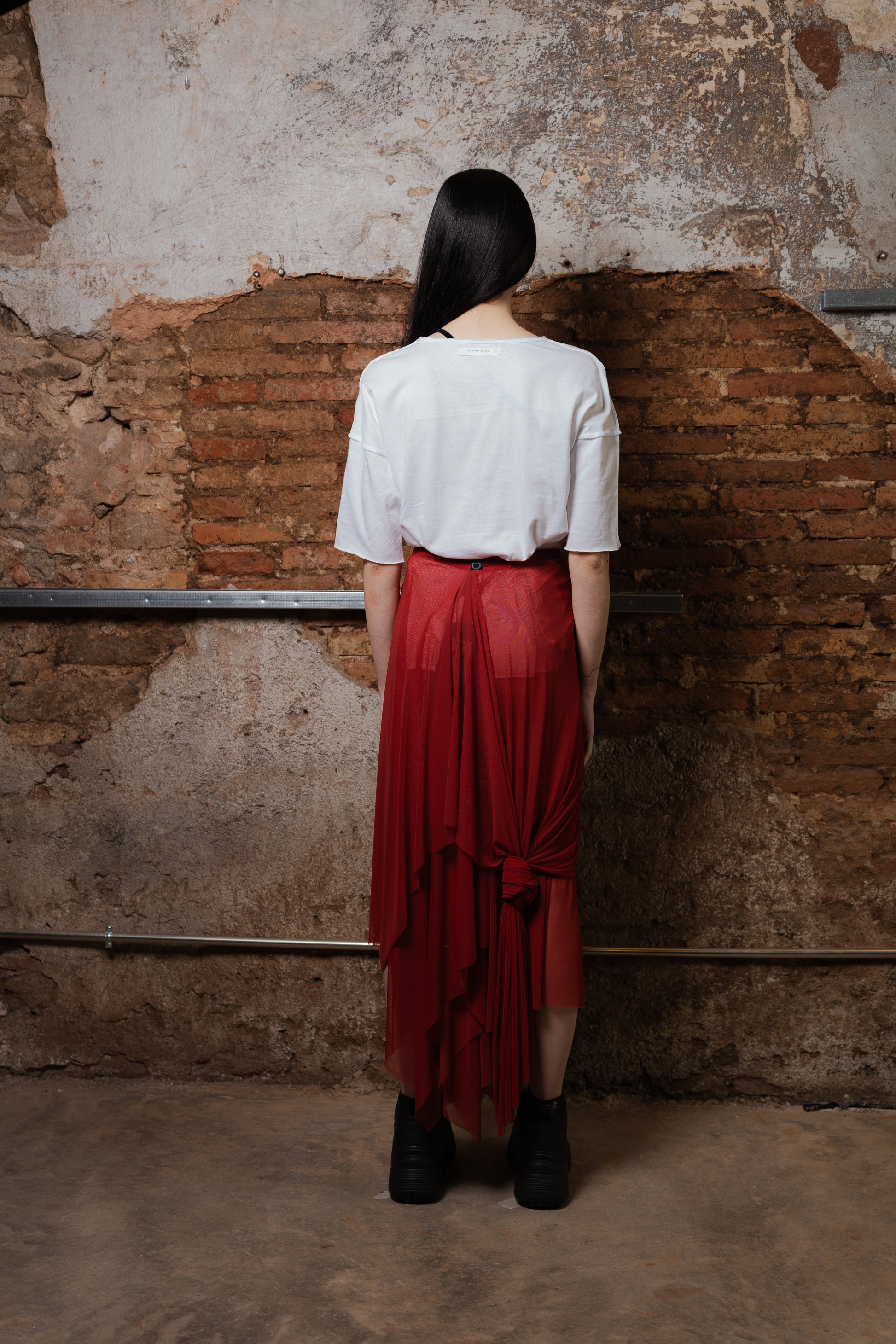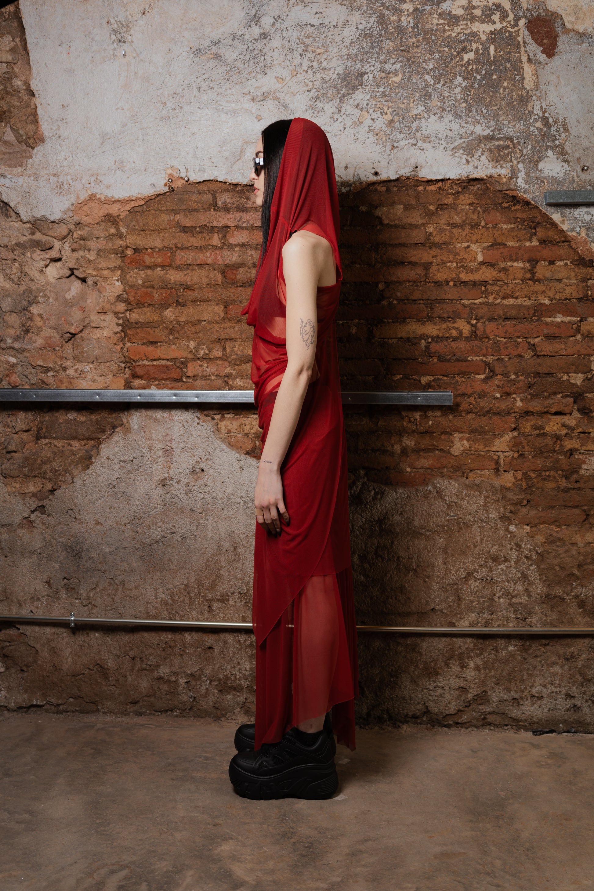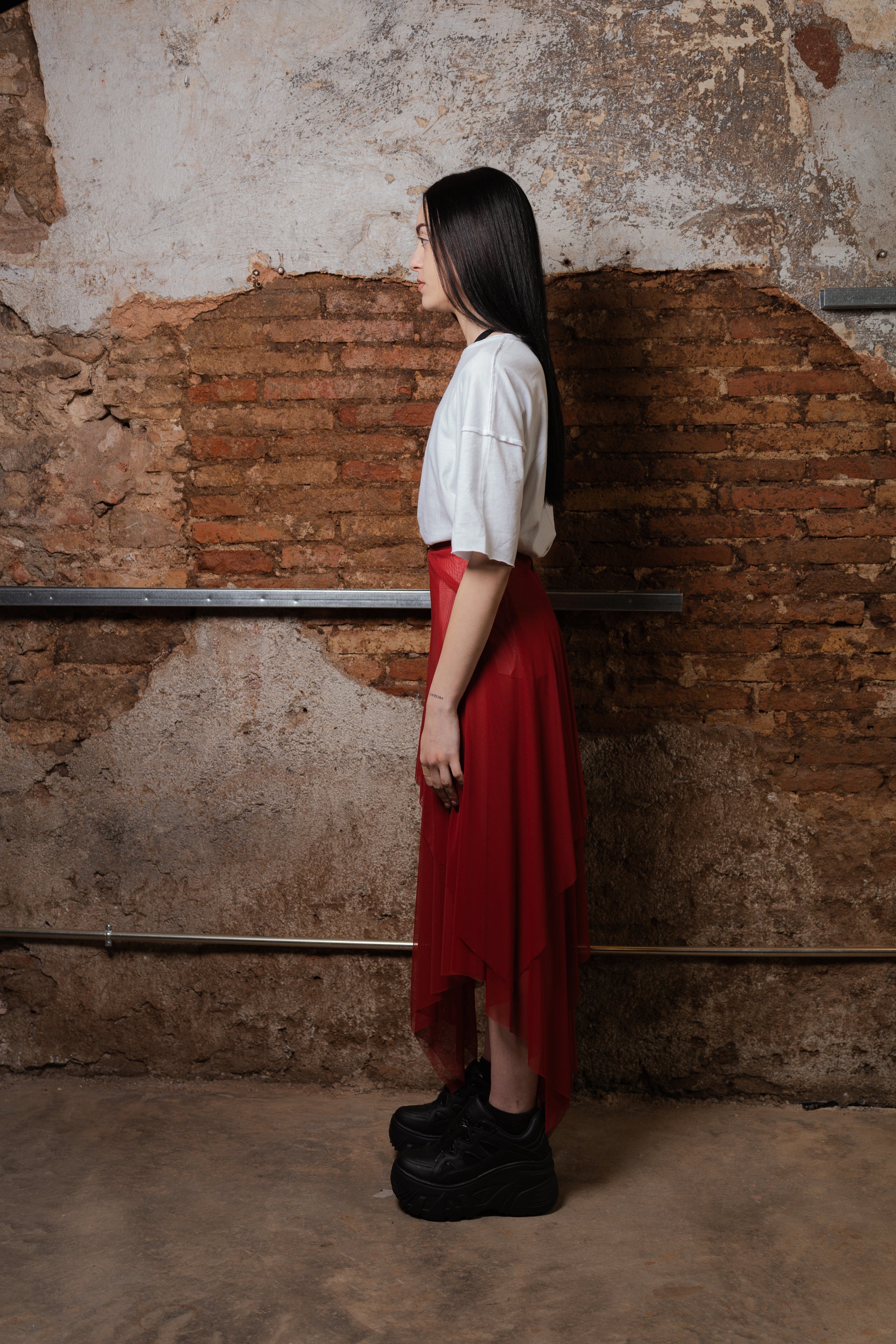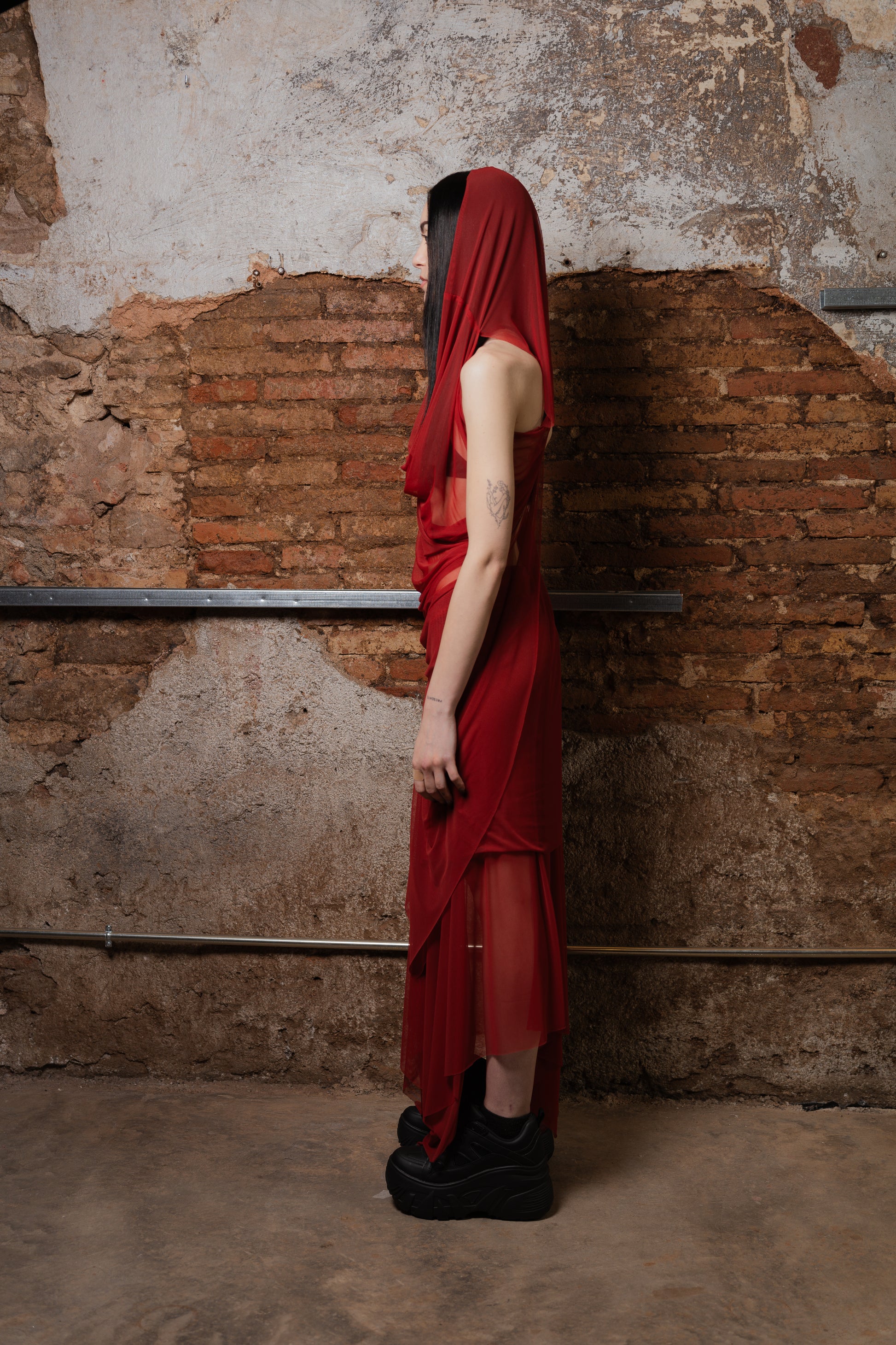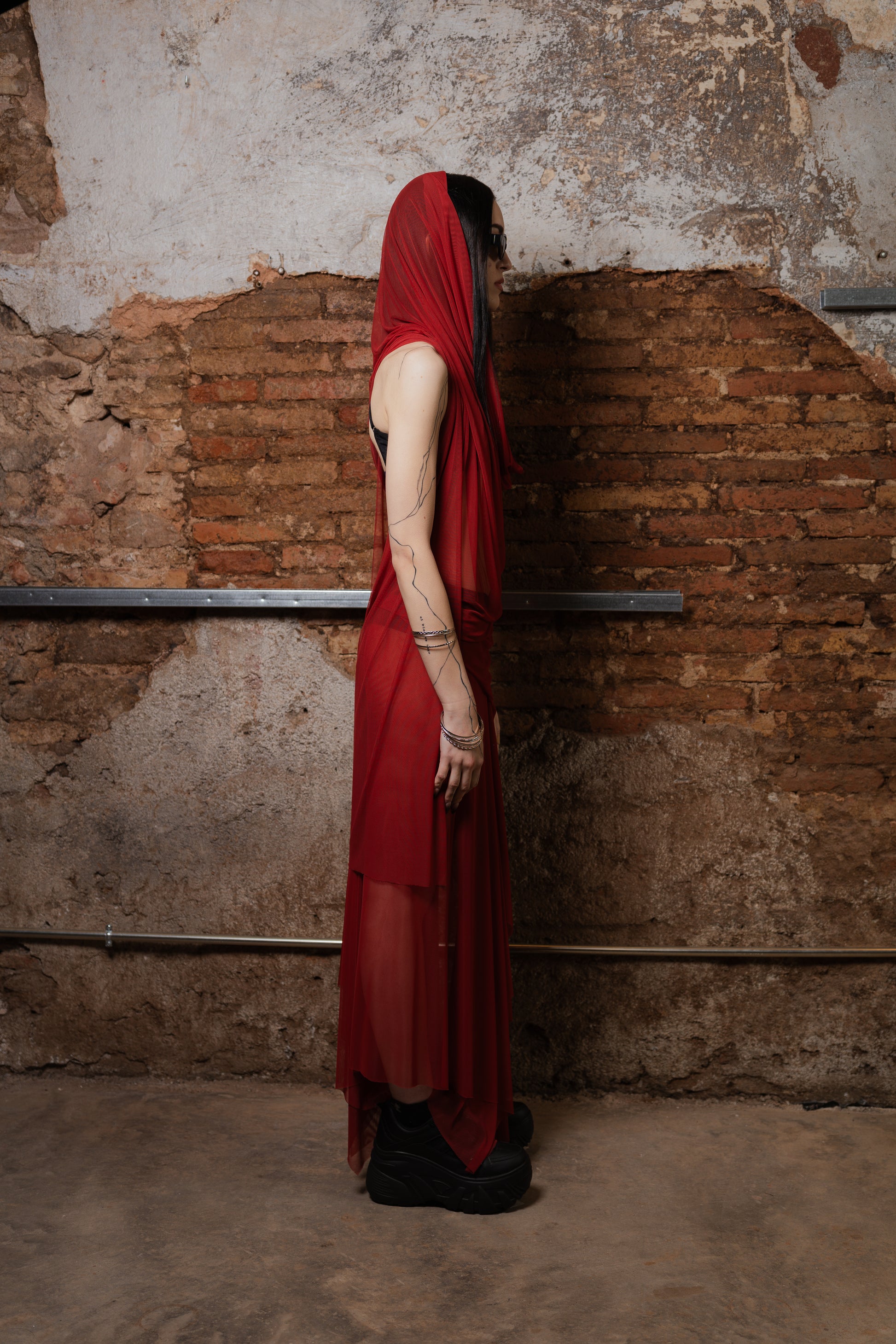La verdadera magia de esta prenda radica en su capacidad transformable, siendo el núcleo de su diseño. La capa superior, cosida en dos puntos del lado derecho, permite múltiples maneras de llevarla. Dale la vuelta, coloca el orificio en el cuello y conviértela en un elegante vestido translúcido, perfecto para combinar con ropa interior de vestir o sobre unos pantalones para un look más atrevido y gender fluid. También puedes llevarla al otro lado del cuerpo, creando una nueva silueta más recogida con drapeados únicos y artísticos, adaptándose a cada ocasión y necesidad de estilo.